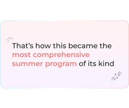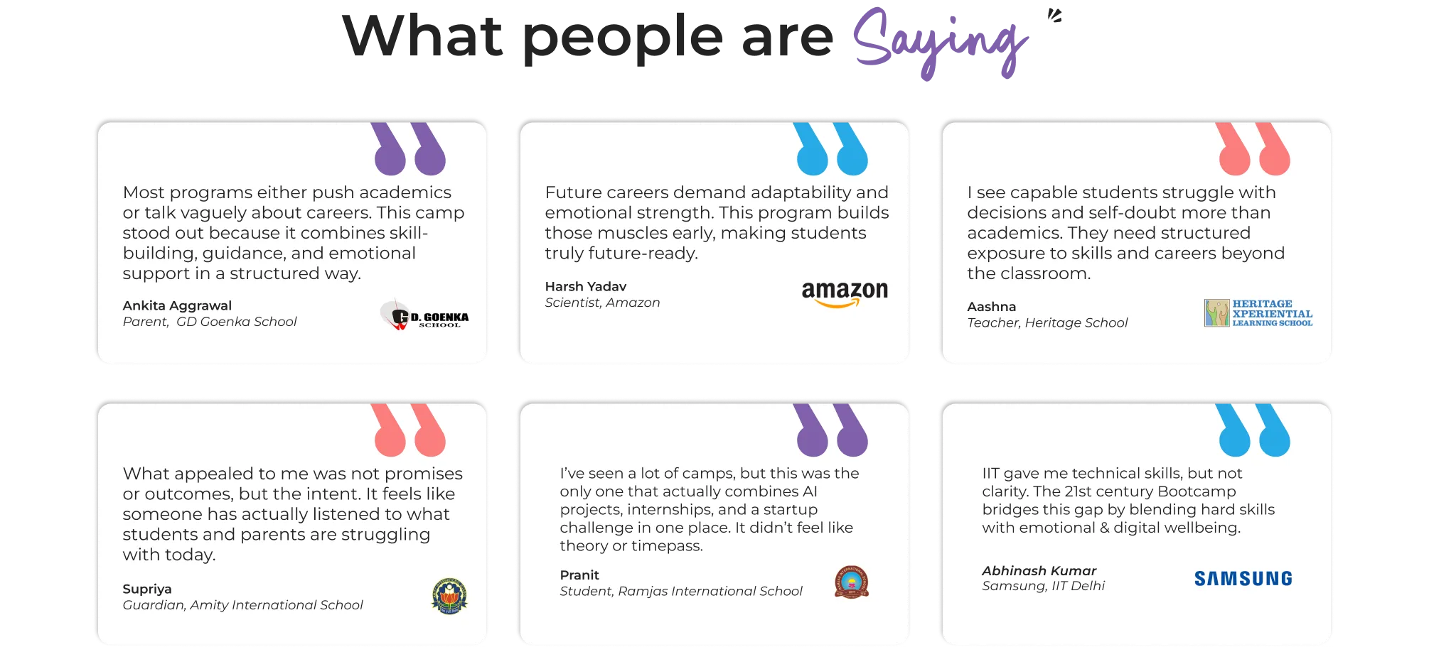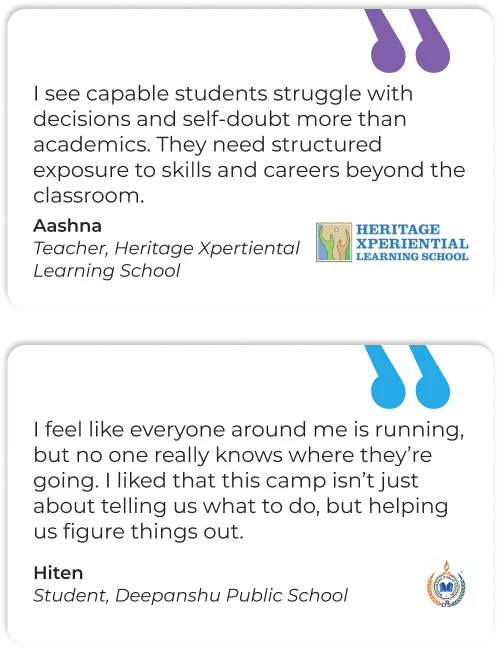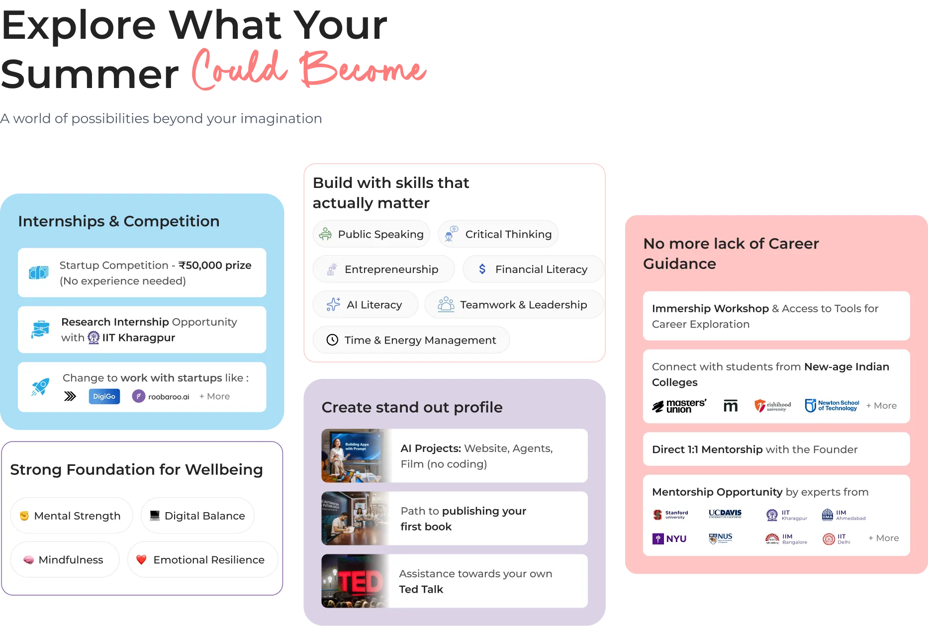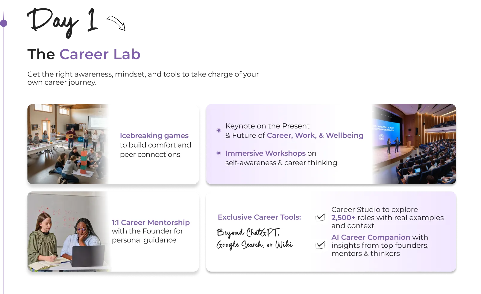 Most programs focus on isolated skills or short‑term outcomes. This camp was built after extensive research into student needs, the future of work, and the growing wellbeing crisis. It integrates career clarity, real‑world skills, experiential learning, and emotional wellbeing into one cohesive ecosystem, designed by experts who have collectively guided tens of thousands of students and professionals.