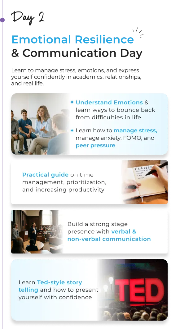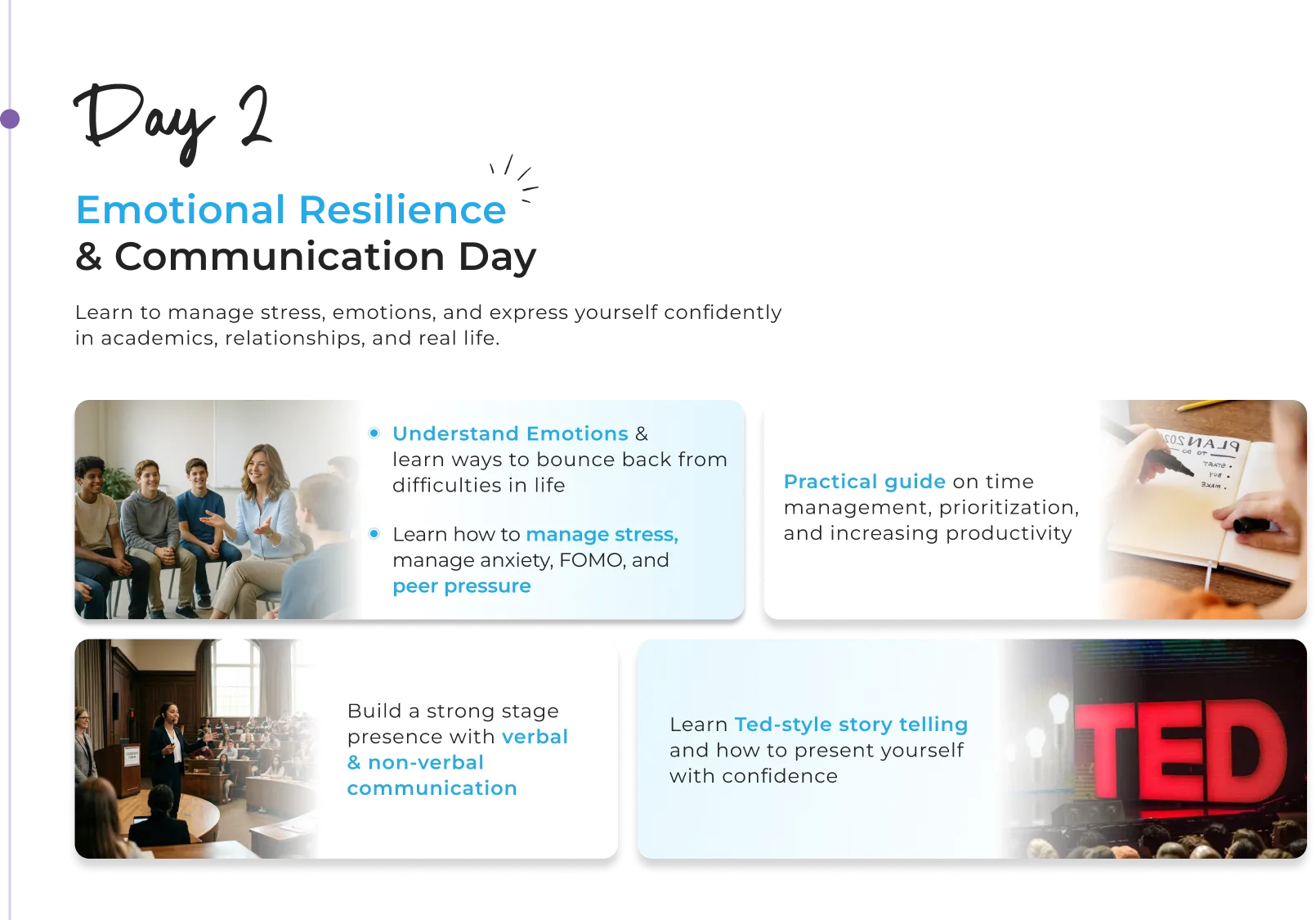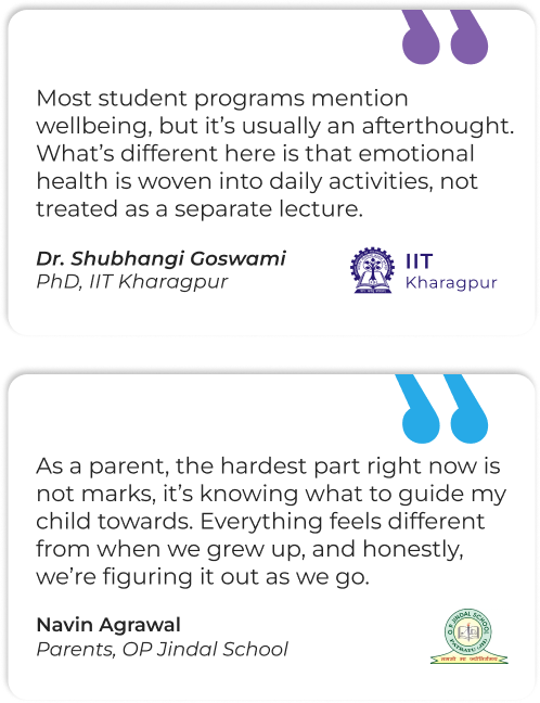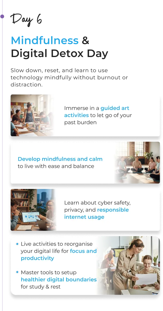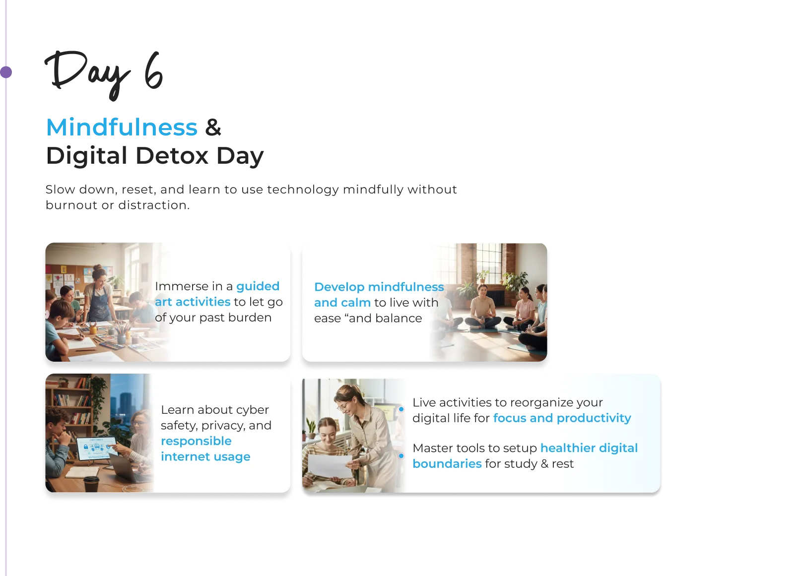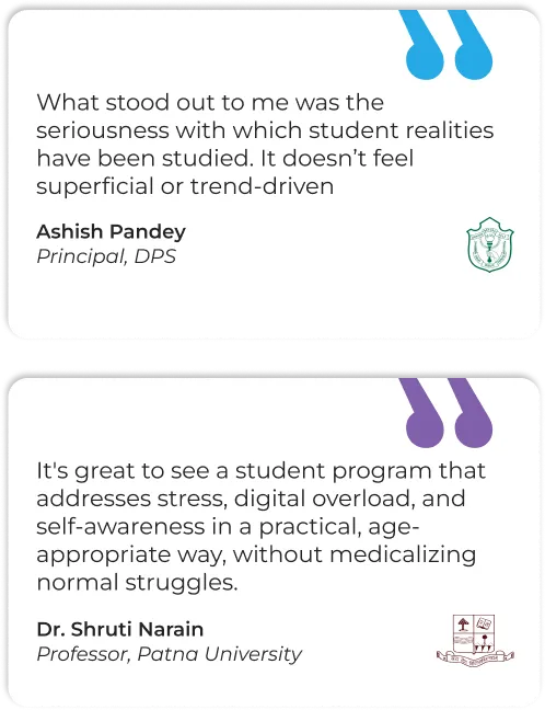 Academic success alone does not guarantee emotional health. The program consciously addresses stress, anxiety, digital overload, and resilience, helping students grow without burning out.