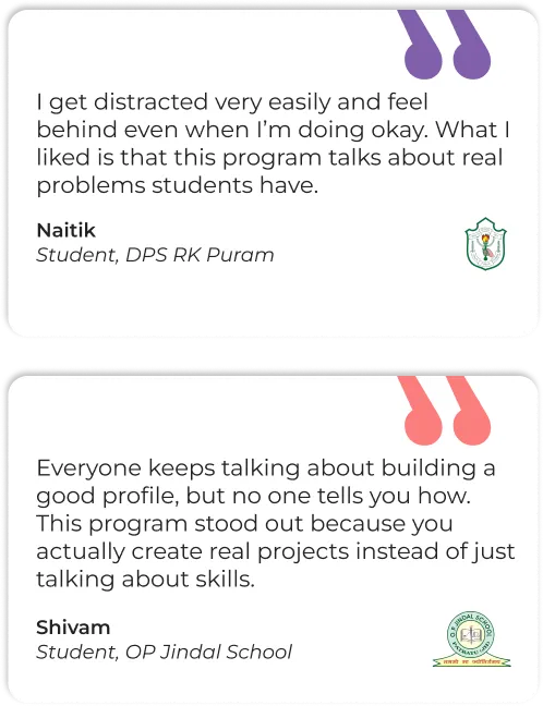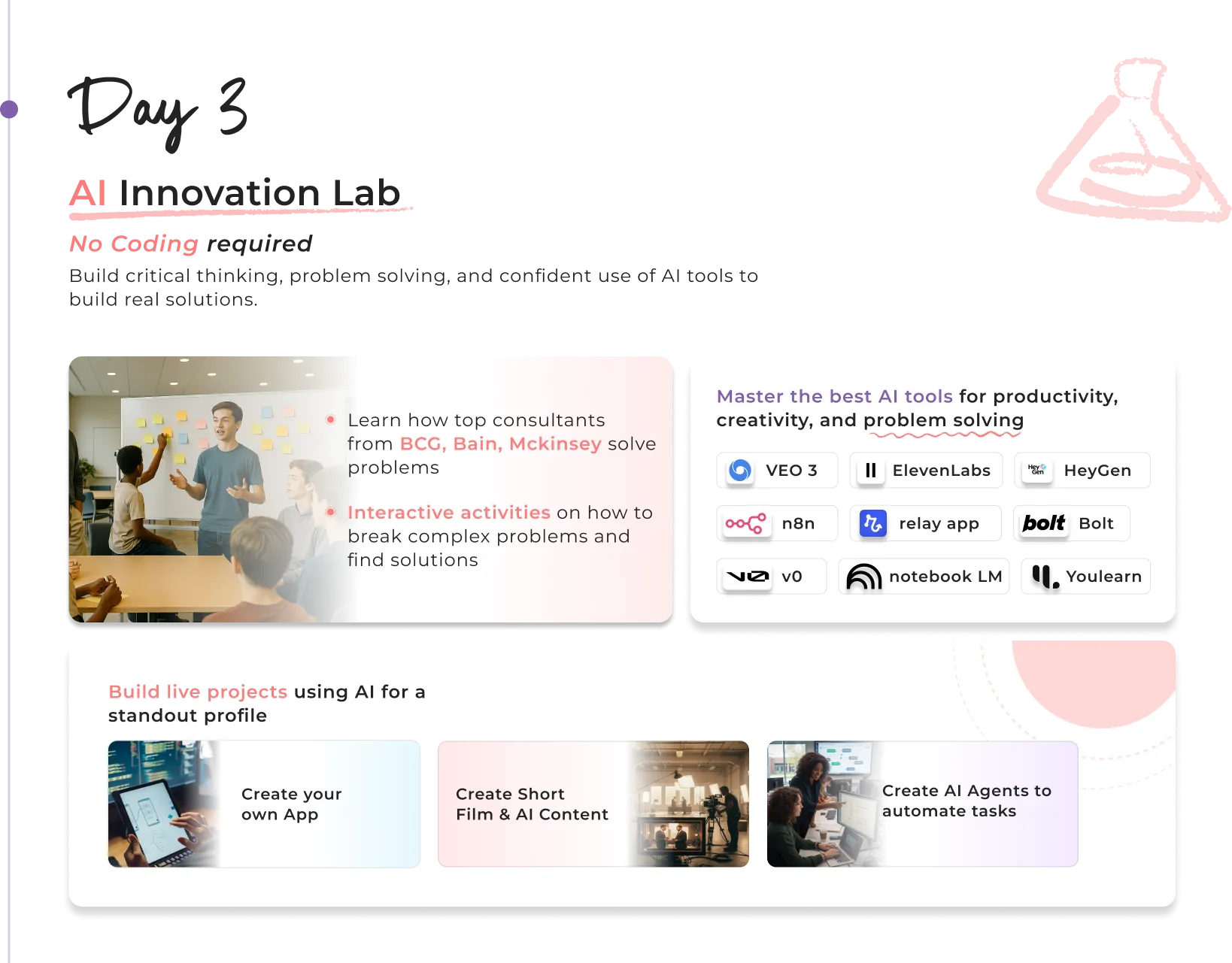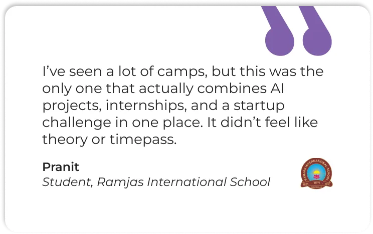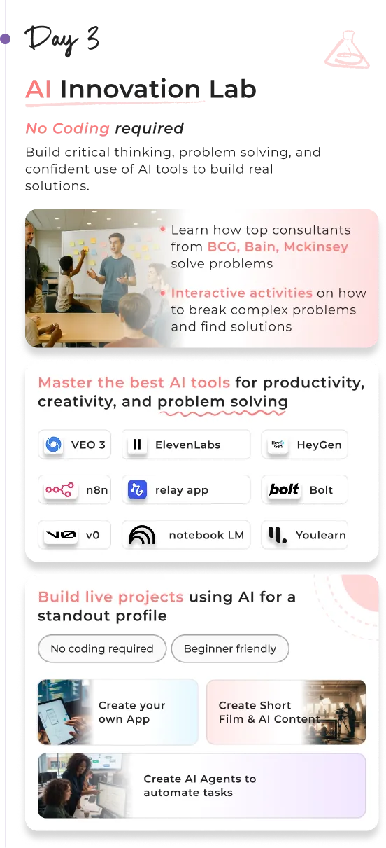 Students build a range of hands‑on projects, including AI‑powered applications, creative outputs, problem‑solving exercises, and collaborative startup ideas. These projects are beginner‑friendly, require no coding, and are designed to strengthen both thinking skills and student profiles.