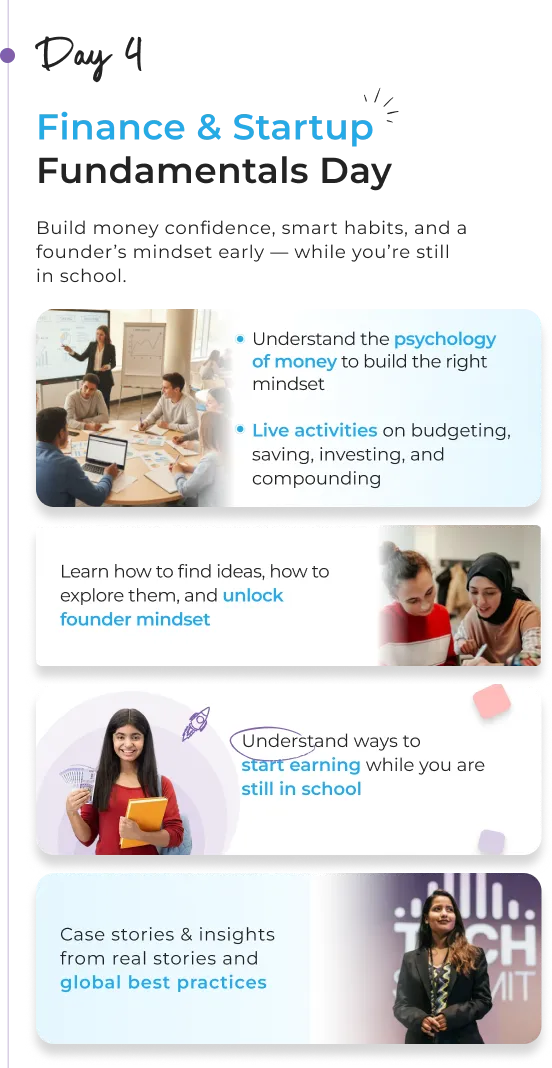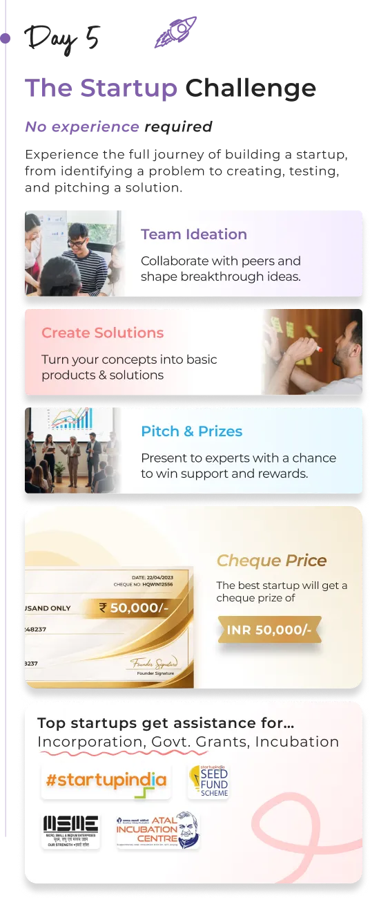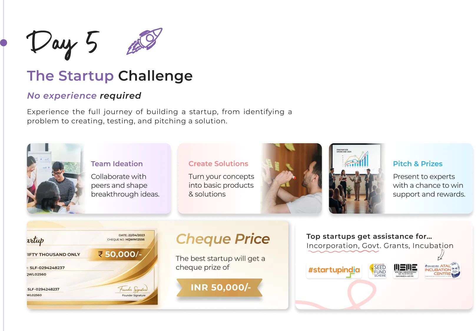 Students experience the full journey of turning an idea into a solution through a guided startup challenge, culminating in expert feedback and recognition of INR 50,000 for winning team. Exceptional ideas may also receive further support like incorporation guide, incubation & grants assistance