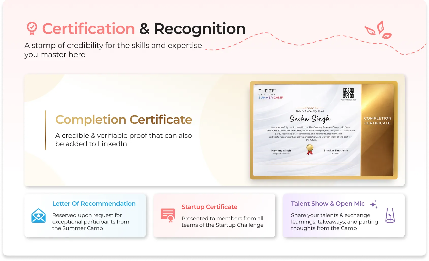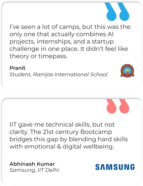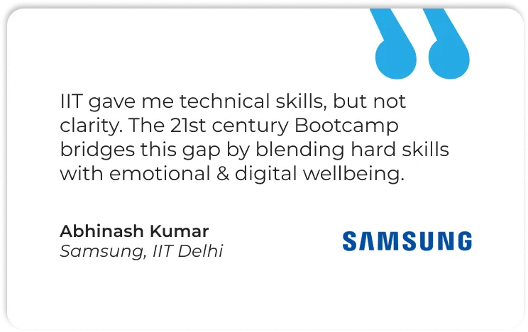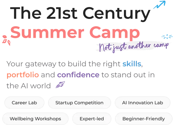 The 21st Century Summer Camp is open to students from Grades 8–12, across all streams like Science, Commerce, and Humanities. We welcome students with all kinds of career aspirations, whether they dream of becoming doctors, engineers, IAS officers, entrepreneurs, artists, researchers, or are still unsure about their path. The program is built on the belief that becoming future‑ready is every student’s right, regardless of background or career goal.