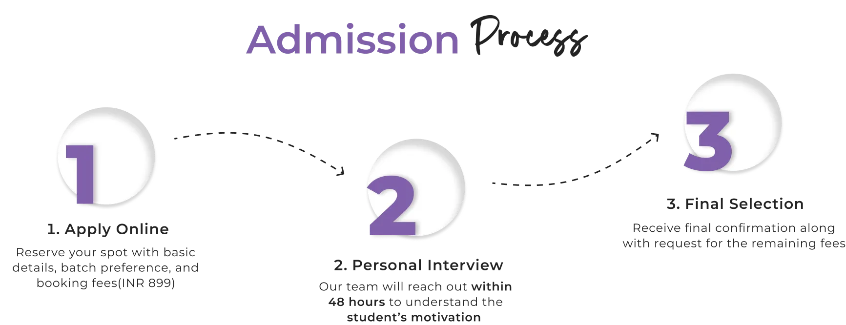 Students apply online by sharing basic details and their preferred batch, followed by payment of a booking fee to reserve a provisional seat. Our team then connects with the student for a short, friendly interaction, and the final confirmation is shared after this conversation.