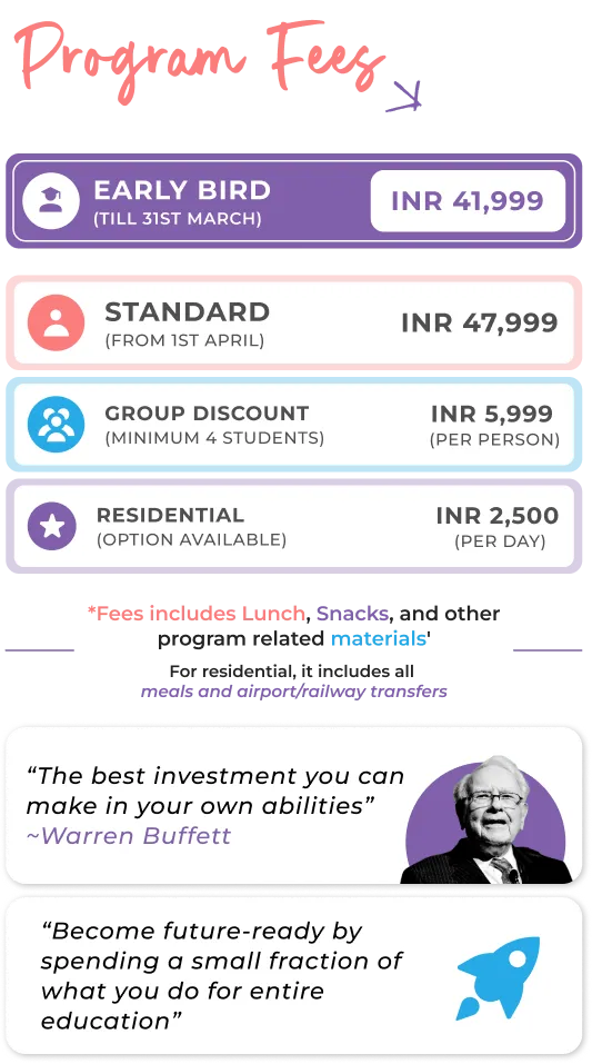 The fee covers all academic sessions, expert‑led workshops, program resources, career exploration tools, participation in competitions, certificates, and meals during session hours. It does not include travel to and from the venue.