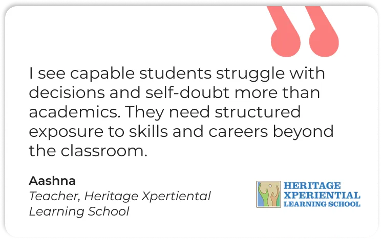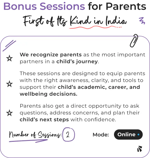 Career guidance is delivered through immersive workshops, access to advanced career exploration tools covering 2,500+ roles, personalised recommendations, one‑on‑one guidance with the Founder, and interaction with experts from leading colleges, companies, and institutions.
