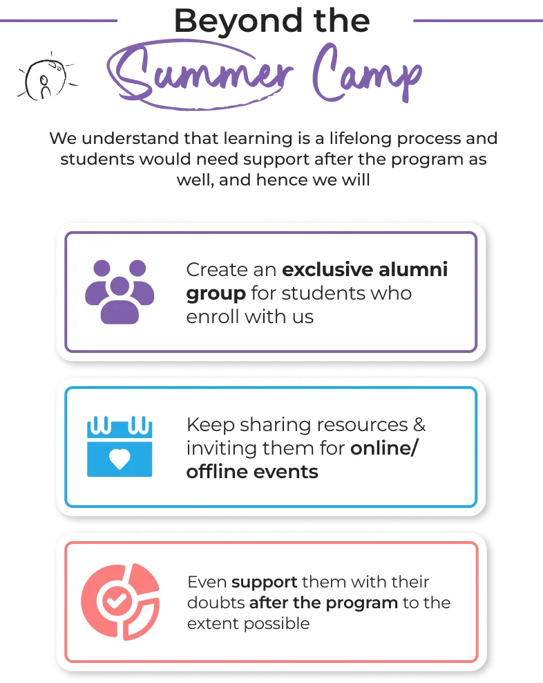 The goal is not to create mastery in one subject but to provide structured exposure, strong foundations, and guided exploration. Students leave with clarity, practical skills, live projects, and tools they can continue using long after the camp ends.
